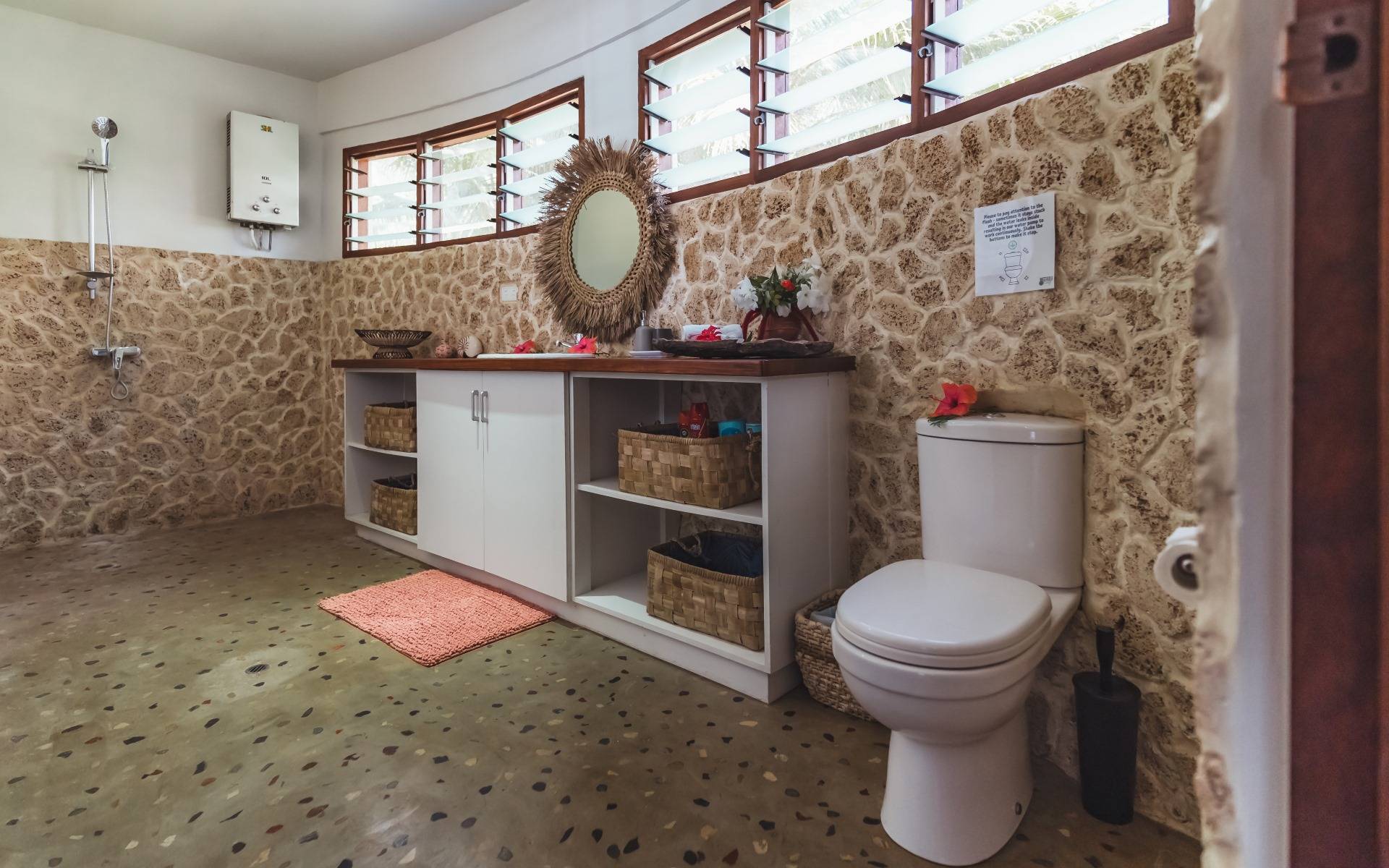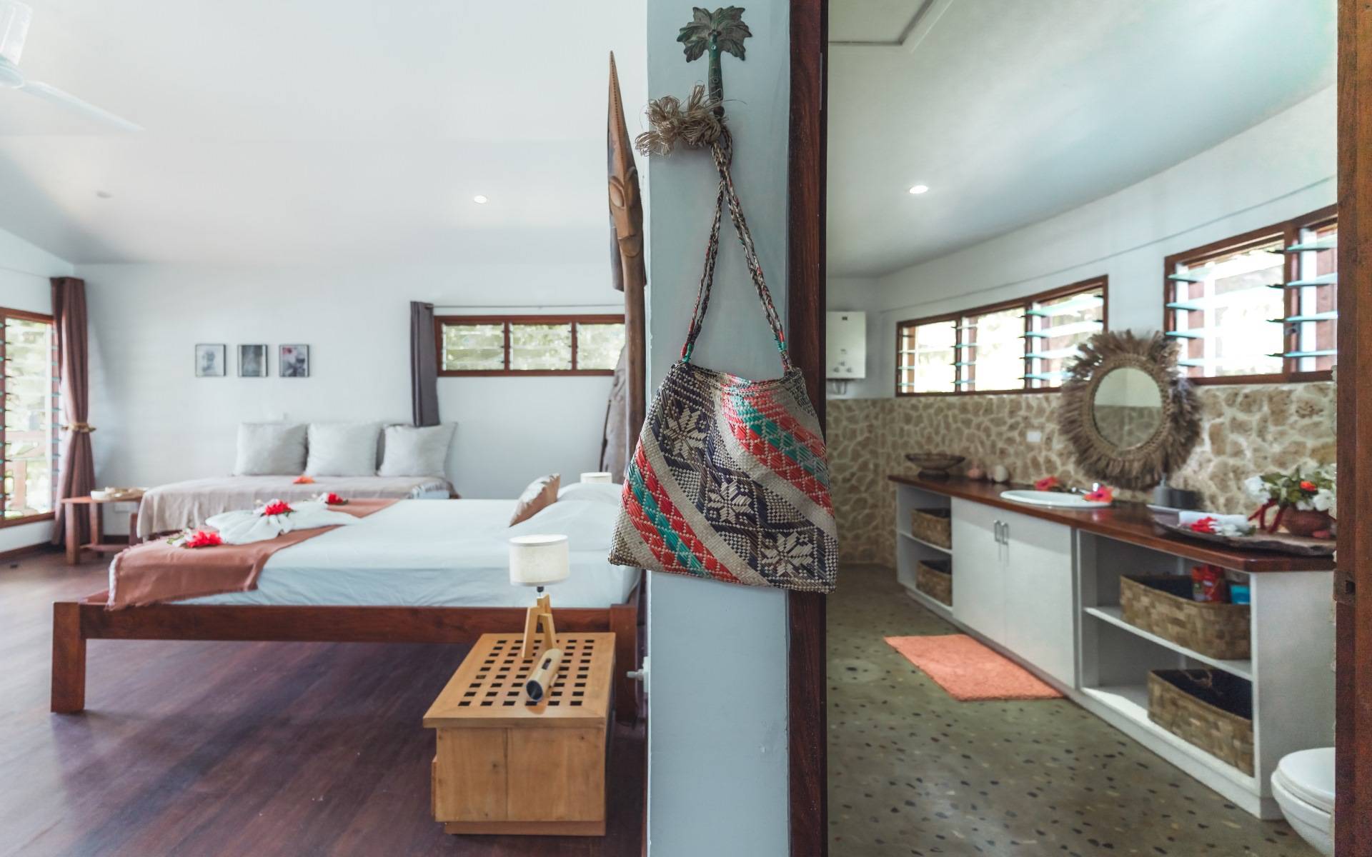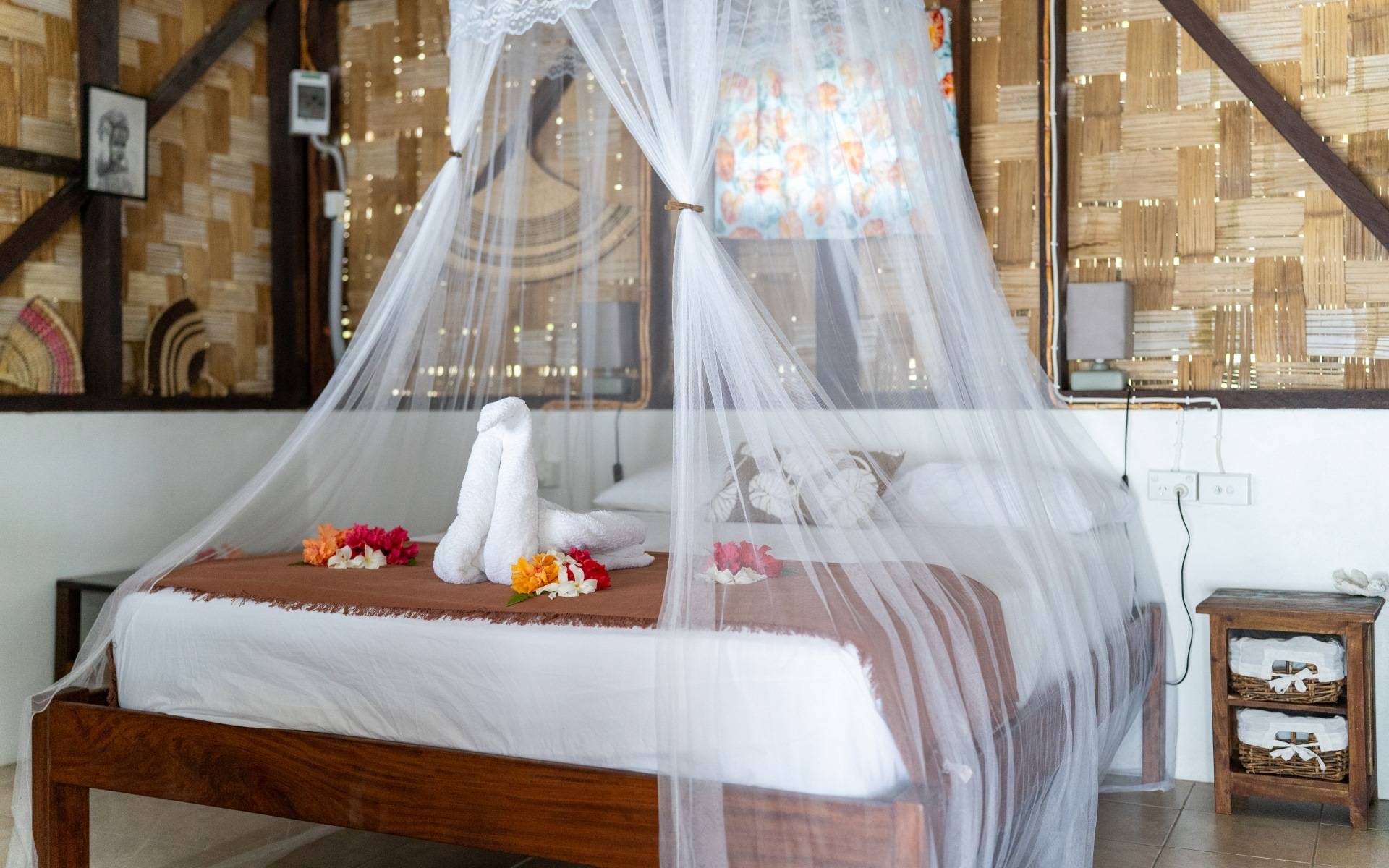 Our Bed & Breakfast features four beachfront bungalows that seamlessly blend modern comfort with the beauty of nature. Each bungalow boasts ocean-view bathrooms and wooden terraces just steps away from the beach, framed by ancient Tamanu trees. Designed with local materials such as Natora timber flooring and Natangora roofs, the interiors are filled with natural light thanks to floor-to-ceiling glass windows, complemented by local handicrafts and carvings that evoke island charm.